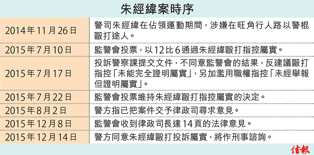 去年佔領期間涉嫌在行人路上揮舞警棍毆打途人的朱經緯,早前被監警會以大比數裁定投訴屬實,惟投訴警察課提交文件,反建議毆打指控「未能完全證明屬實」,另加濫用職權指控「未經舉報但證明屬實」。其後監警會再開會投票,維持毆打指控屬實的決定。