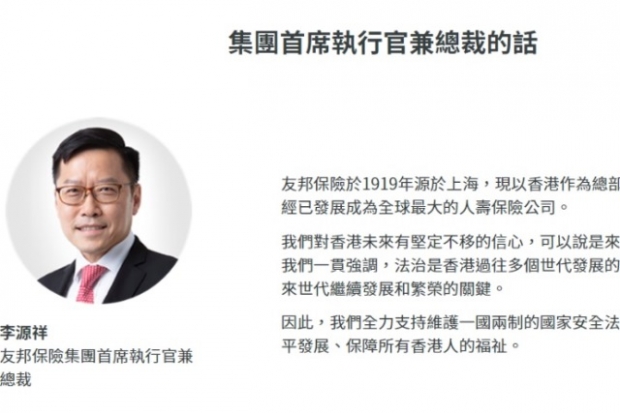 友邦保險集團首席執行官兼總裁李源祥在公司網頁表示,該公司全力支持維護「一國兩制」的國家安全法,它將促進香港的和平發展、保障所有香港人的福祉。